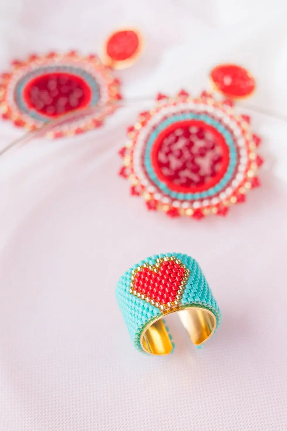 Featuring a beautiful red heart pattern on a dreamy blue background, it’s perfect for adding a pop of color to your everyday look. Handmade with Miyuki beads, 18K gold-plated, and adjustable for a perfect fit!